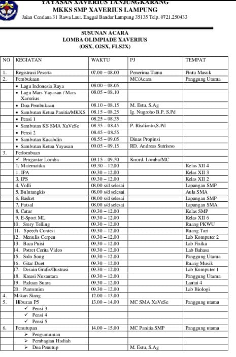 Pringsewu, 25 Oktober 2024 – Sebanyak 9 sekolah dari tingkat SMP Xaverius se-Lampung memadati gedung SMA Xaverius Pringsewu untuk mengikuti perlombaan akbar yang di prakarsai oleh MKKS SMP Xaverius se-Lampung. Perlombaan ini meliputi Olimpiade Sains, Festival Seni, dan Olimpiade Olahraga ini. Pelaksanaan even bergengsi tingkat Xaverius ini di adakan di SMA Xaverius dan SMP Xaverius dengan memgusung tema ” Raih Prestasi Menjadi Xaverian Sejati “. Bebrapa tujuan yang ingin di capai dalam even ini adalah mengembangkan bakat dan prestasi siswa dalam bidang akademik, dan non akademik, mengembangkan nilai-nilai karakter kejujuran, kedisiplinan, sportivitas dan persaudaraan serta menjalin persatuan dan keakraban antar siswa dan antar guru SMP Xaverius se-Lampung dan guru SMA Xaverius Pringsewu.